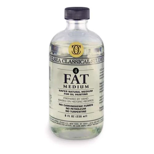 Chelsea Classical Studio Fat Medium is a handmade oil medium crafted from a mixture of pure, extra-pale, cold pressed linseed oil and lavender damar varnish. It is glossy, quick-drying, resistant to yellowing and is recommended for later layers of paint and as a glaze.