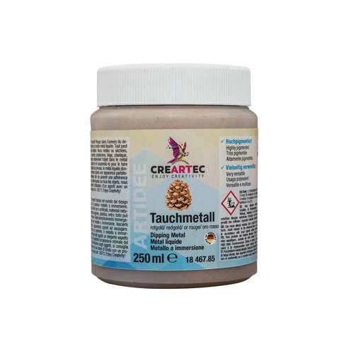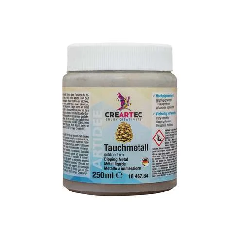 This Creartec Dipping Metal is a thin, flowing metal dispersion, mixed with microfine brass, copper or silver particles. You can immerse objects directly in the immersion medium or, alternatively, apply the medium in multiple layers with a brush. It dries completely within 40 – 60 minutes and immediately shows its metallic sheen.